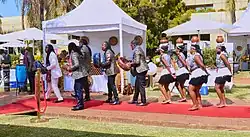 The Republic of Zimbabwe has a population that is about 16 million people; the majority, about 76%, live in rural areas. This is a very important detail in light of how many crops are produced by Zimbabwe: coffee, corn, wheat, sugar, tea, and cotton.[1] This agricultural aspect of life is apparent in many of the dances they perform[2] The official language is English, although the Muslim, Hindu, Bahá'í, and traditional ethnic religions are also practiced.[1] There are at least 20 ethnic groups in Zimbabwe, the majority being Shona (about 5 million people), Ndebele (about 2 million people). and others are Ndau, Venda, Tonga just mention but a few. There is some division between these groups due to battles between the Shona and Ndebele people in the previous century. Each group has its own history, subculture, and political significance, yet they share many religious and cultural beliefs as well. Every aspect of their culture influences the dances in which they perform.[2]