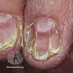 • Subungual hyperkeratotic fragments. Thickened skin that is often discolored, under nails, on either hands or feet.