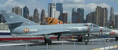 During December 1961, the French Navy took delivery of their first Étendards. The following year, the type was deployed for the first time aboard both of the service's newly built Clemenceau-class aircraft carriers, the Clemenceau and Foch.[1][5] The Étendard IVM was in French Navy service for several decades, even following the development of the more capable Super Étendard. The type was gradually relegated to secondary missions in favour of the Super Étendard; as such, it was phased out from active combat roles during 1987.[3]