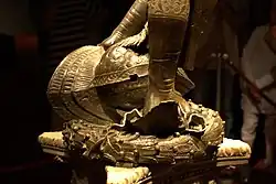 The traditional identification of the figure was questioned in 1939 by Jenő Lányi, with an interpretation leaning toward ancient mythology, the hero's helmet especially suggesting Hermes or Mercury. A number of scholars since have followed Lányi, sometimes referring to the statue as David-Mercury.[18] If the figure were indeed meant to represent Mercury, it may be supposed that he stands atop the head of the vanquished giant Argus Panoptes. However, all quattrocento references to the statue identify it as David.[19]