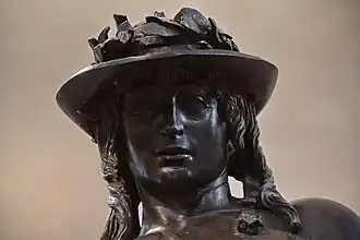 The figure has been interpreted in a variety of ways. One has been to suggest that Donatello was homosexual and that he was expressing that sexual attitude through this statue.[13][14] A second is to suggest that the work refers to homosocial values in Florentine society without expressing Donatello's personal tendencies.[15][16] A third interpretation is that David represents Donatello's effort to create a unique version of the male nude, to exercise artistic licence rather than copy the classical models that had thus far been the sources for the depiction of the male nude in Renaissance art.[17]