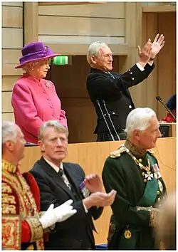 In 1984, Lord Airlie resigned from Schroder to take up the position of Lord Chamberlain of the Household, the most senior office in the Royal Household.[7] He was sworn into the Privy Council and appointed a Knight Grand Cross of the Royal Victorian Order.[8] In his capacity as Lord Chamberlain, he was chancellor of the Royal Victorian Order. He was following in the footsteps of his late father, who had served as Lord Chamberlain of Queen Elizabeth The Queen Mother's household.