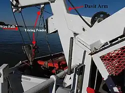 A davit (/ˈdeɪvɪt/)[1] is any of various crane-like devices used on a ship for supporting, raising, and lowering equipment such as boats and anchors.[2]