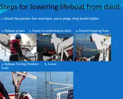 - Free fall – Lifeboat slides right off vessel. Lifeboat must be an enclosed type. Main type of Davit on merchant ships now. This type does not use falls.