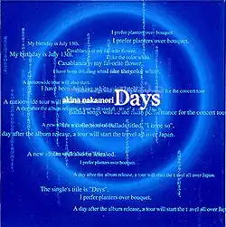 "Days" (デイズ, Deizu) is the 42nd single by Japanese entertainer Akina Nakamori. Written by Nakamori and Tetsurō Oda, the single was released on April 30, 2003, by Universal Music Japan. It was also the lead single from her 21st studio album I Hope So.[1][2][3]