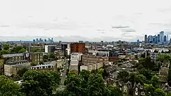 Aerial view of London city and Canary Wharf from De Beauvoir Square