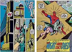 "The Night Gwen Stacy Died", alternatively known as "The Green Goblin's Last Stand", is a story arc of the Marvel Comics comic book series The Amazing Spider-Man #121–122 (June–July 1973). The two-issue story was written by Gerry Conway, with pencil art by Gil Kane and inking by John Romita Sr. and Tony Mortellaro. The story features a confrontation between Spider-Man and the Green Goblin. Having discovered Spider-Man's identity, the Green Goblin abducts Spider-Man's girlfriend Gwen Stacy. Gwen is killed during the battle, and a subsequent fight results in the Goblin's death.