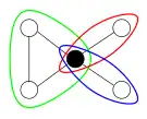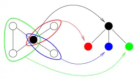 | The primal graph of a constraint satisfaction problem (every node represents a variable and every edge a constraint between two variables) | Its biconnected components (colored) and its separating vertices (black, only one in this case) | The biconnected decomposition: nodes of the tree are separating vertices and biconnected components |
