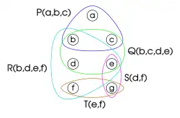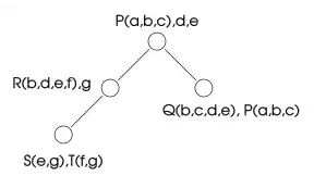 | A hypergraph representation of a constraint satisfaction problem: the constraints are given names (P, Q, R, S, T), and their scopes are shown (P (a, b, c) means that constraint P is on the variables {a, b, c} | A query decomposition of the problem. Nodes may contain variables, constraints, or both. Although to the rightmost node are associated a total of five variables (i.e. a,b,c,d,e among the two constraints), this is a decomposition of width 3 because no node contains more than three constraints and isolated variables (there is another decomposition of width 2 and it is possible to show that this decomposition of width 2 is the minimum width of this hypergraph). |