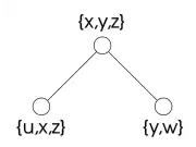 A decomposition tree; for every edge of the original graph, there is a node that contains both its endpoints; all nodes containing a variable are connected |