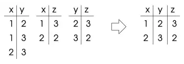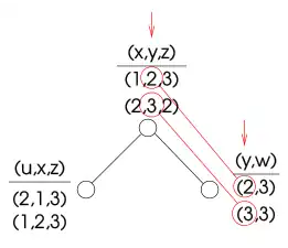 Each node of the tree is made a variable. Its domain is the set of solutions of the partial problem, which is a set of tuples. The constraints of the new problem allow only the tuples that contain equal values of the original variables. In the figure, equality of is shown: the corresponding constraint is only met by the first tuple of and the first tuple of , and by the second tuple of and the second tuple of . Moreover, the second tuple of cannot find a satisfied tuple in its left child (). Thus, the second tuple of should be removed. |