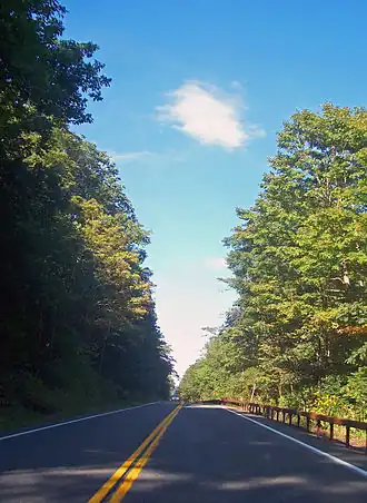Due to its steep slopes, the notch largely avoided any of the exploitation that characterized Catskill forests prior to the establishment of the Forest Preserve in 1885.[9] In the late 1820s the Greene and Delaware Turnpike was built through the notch, connecting the large tannery at Hunter with Middletown in Delaware County.[1] In addition to the entire northern segment of Route 42 from Shandaken to Lexington, this route is today followed by corresponding portions of routes 23A and 28 at the north and south respectively.