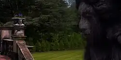 Split-field diopter focus of two statues in a garden, one close and one further away