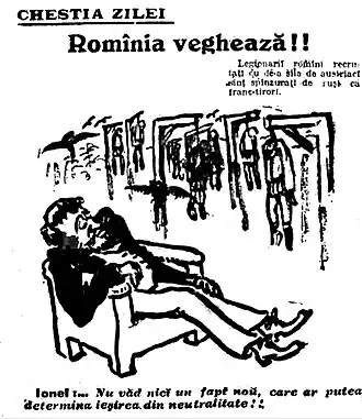Cartoon in Adevărul, January 1915, mocking Romania's neutrality during the massacres of Bukovina's "legionaries"