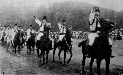 Arcași youth on horseback giving the Roman salute to Carol II (Bucșoaia, 1937)