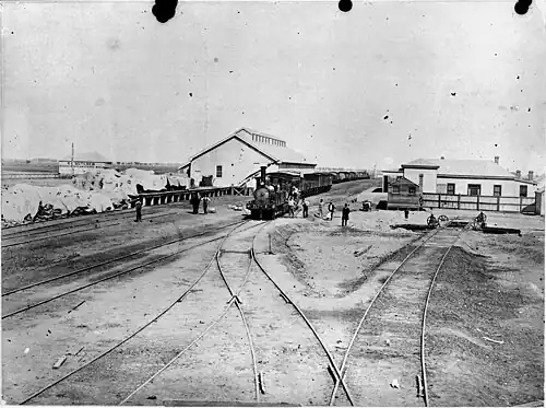 Deniliquin railway station was opened on 4 July 1876 where a large crowd of people assembled to greet the arrival of the first train at 2 pm, celebrated by performances from the town's brass band.[5] A ceremony took place in the station's large good shed to mark the opening of the line, attended by up to 700 people including the directors of the railway company as well as John Hay, MP for The Murray.[5][4]