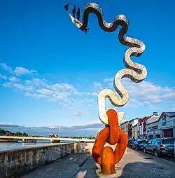 "Last Journey" ("Turas Set Caithe") was installed on Grattan Quay in Waterford, Ireland, in 2010. It is 8 metres (26 ft) high; it shows a tall ship above a twisting line of stainless steel, which stands a base of chain links of corten steel. The sculpture refers to Waterford's shipbuilding tradition, its history as a departure point for emigrants, and to The Three Sisters, the three rivers flowing into Waterford, represented by the twisting steel.[3]