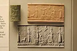 Additionally, he is referred to as "Dumuzi the shepherd", as the fifth legendary monarch preceding the Flood.[32] He probably rules the city of Bad-tibira because the cult of the god Dumuzi is held there.[35] From the Third Dynasty of Ur, kings who already engage in ritual union with Inanna appear to fully identify with "Dumuzi the shepherd" as shepherds of the people.[36] It can thus be postulated that the "great Apple Tree of the lowland of Kulaba", as referenced in the Descent of Inanna to the Underworld, may be the throne of Uruk upon which a king named "Dumuzi the fisherman" sits. This would make him the fourth king of the first dynasty of Uruk-Kulaba, a period that commenced long after the legendary flood.[35]