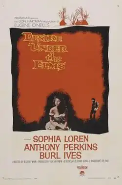 Desire Under the Elms is a 1958 American film version of the 1924 play Desire Under the Elms written by Eugene O'Neill. The film was directed by Delbert Mann from a screenplay by O'Neill and Irwin Shaw. The cast included Sophia Loren as Abbie (known as Anna in the film), Anthony Perkins as Eben, Burl Ives as Ephraim, Frank Overton as Simeon, and Pernell Roberts as Peter. The film was nominated for Best Black and White Cinematography (Daniel L. Fapp) at the Academy Awards and Laurel Awards in 1959. It was also entered into the 1958 Cannes Film Festival.[2]