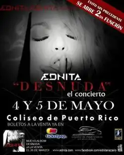 Desnuda El Concierto (also referred to as Desnuda Tour) is the concert tour by Ednita Nazario in support of her studio album Desnuda, produced by Angelo Medina. In her last musical production, Ednita began a journey of discovery what she shared with her fans all over the world. The album was particularly poignant since it was accompanied by moments of great happiness, becoming critical and sales success. Throughout the race Ednita prolific and diverse, she has won countless awards and recognitions, and excelled in many artistic endeavors.[3]