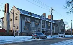 In 1913, the school decided to develop an eastern branch campus to serve students on the city's east side.[7] This site in Indian Village along Charlevoix was chosen, and the school again contracted Albert Kahn to design a new building.[8][9] The building is one of only three schools designed by Kahn, and the only one still extant.[10] Kahn's design for the school drew from then-popular English influences,[11] and was a radical departure from previous school designs, both in his extravagant use of windows and use of stucco rather than brick.[9] The building opened the following year as the "Eastern Liggett" branch.[8] In 1916, landscape architect O. C. Simonds designed a landscape plan for the school.[12]