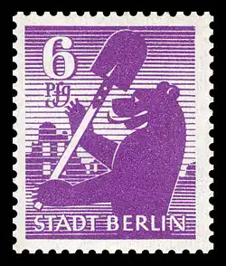 The first stamps were issued as "Deutsche Post", in 1952 the inscription was changed to "Deutsche Post Berlin", and three years later to "Deutsche Bundespost Berlin".[8] Many stamps had the same appearance as the stamps of the Federal Republic of Germany with just the inscription changed, while others were distinctly different.