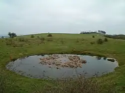 A dew pond is an artificial pond usually sited on the top of a hill, intended for watering livestock. Dew ponds are used in areas where a natural supply of surface water may not be readily available. The name dew pond (sometimes cloud pond or mist pond) is first found in the Journal of the Royal Agricultural Society in 1865.[1] Despite the name, their primary source of water is believed to be rainfall rather than dew or mist.[2][3]