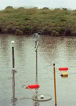 In situ measurements of evaporation and condensation were taken at the Helmfleeth dew pond in Poppenbüll municipality (Eiderstedt Peninsula in Schleswig-Holstein, Germany) using meteorological measuring instruments and a floating evaporation pan after Bernhard Brockamp & Julius Werner (1970).[26] These measurements proved the dew formation on the basis of temperature changes and the weather conditions.[27][28] The Helmfleeth dew pond is part of the water supply for a marsh area and is still in use today.[29]