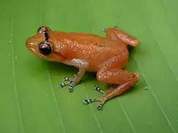 Adult males measure 17–22 mm (0.7–0.9 in) and adult females 21–25 mm (0.8–1.0 in) in snout–vent length.[5] The head is as wide as the body and longer than it is wide. The snout is long, and subacuminate in dorsal view, and truncate in lateral view. The tympanum has its upper edge hidden by the low, poorly defined supra-tympanic fold. The fingers have weak lateral keels and small discs. The toes are basally webbed and have lanceolate discs. Dorsal skin is smooth but may have low tubercles in some specimens. The dorsum is yellowish-tan with yellow flanks. There are some reddish brown dorsal markings: an inter-orbital bar, narrow canthal and broader post-orbital stripes, as well as smaller markings in the scapular region and on the shanks. The iris is golden bronze and has a reddish-brown horizontal streak.[6]