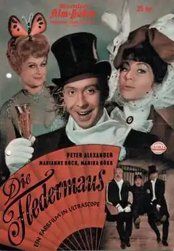 Die Fledermaus is a 1962 Austrian musical film directed by Géza von Cziffra and starring Peter Alexander, Marianne Koch and Marika Rökk.[1] It is an adaptation of the operetta Die Fledermaus by Johann Strauss II, Karl Haffner and Richard Genée.