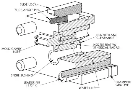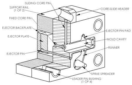 Other die components include cores and slides. Cores are components that usually produce holes or opening, but they can be used to create other details as well. There are three types of cores: fixed, movable, and loose. Fixed cores are ones that are oriented parallel to the pull direction of the dies (i.e. the direction the dies open), therefore they are fixed, or permanently attached to the die. Movable cores are ones that are oriented in any other way than parallel to the pull direction. These cores must be removed from the die cavity after the shot solidifies, but before the dies open, using a separate mechanism. Slides are similar to movable cores, except they are used to form undercut surfaces. The use of movable cores and slides greatly increases the cost of the dies.[17] Loose cores, also called pick-outs, are used to cast intricate features, such as threaded holes. These loose cores are inserted into the die by hand before each cycle and then ejected with the part at the end of the cycle. The core then must be removed by hand. Loose cores are the most expensive type of core, because of the extra labor and increased cycle time.[11] Other features in the dies include water-cooling passages and vents along the parting lines. These vents are usually wide and thin (approximately 0.13 mm or 0.005 in) so that when the molten metal starts filling them the metal quickly solidifies and minimizes scrap. No risers are used because the high pressure ensures a continuous feed of metal from the gate.[18]