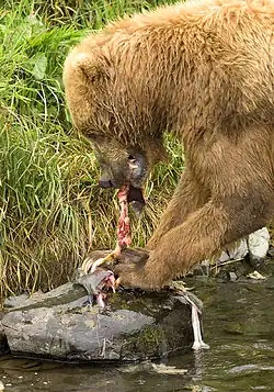 By far the closest dietary relationship between brown bears and fish occurs between the salmon and trout of the genus Oncorhynchus, particularly in coastal areas, but also in some inland areas of North America.[46] In the Kamchatka peninsula and several parts of coastal Alaska, including Kodiak Island, brown bears feed largely on spawning salmon, whose nutrition and abundance explain the enormous size of the bears in these areas.[46][47] Sockeye salmon (O. nerka) and pink salmon (O. gorbuscha) are the two most commonly preyed upon, but many coho (O. kisutch), Chinook (O. tshawytscha), masu (O. masou) and chum salmon (O. keta) are also taken.[48][49][50][51][52] Even in the coastal ranges of the Pacific, a diverse omnivorous diet is eaten, with the salmon spawning reliably providing food only in late summer and early fall. Exceptionally, salmon may come to inland rivers as early as June in the Brooks River when other coastal Alaskan bears are in their dietary "lean period" and provide food for bears sooner than normal.[53] On Kodiak island, it appears the availability of alternative food sources is high, as berry crops are often profuse, marine organisms often wash up and ungulates both wild and domesticated are available.[54][55] The fishing techniques of bears are well-documented. They often congregate around falls when the salmon are forced to breach the water, at which point the bears will try to catch the fish in mid-air (often with their mouths). They will also wade into shallow waters, hoping to pin a slippery salmon with their claws.[46][56] While they may eat almost all the parts of the fish, bears at the peak of spawning, when there is usually a glut of fish to feed on, may eat only the most nutritious parts of the salmon (including the eggs (if the salmon is female) and the head) and then indifferently leave the rest of the carcass to scavengers, which can include red foxes (Vulpes vulpes), bald eagles (Haliaeetus leucocephalus), common ravens (Corvus corax) and gulls.[50] Despite their normally solitary habits, brown bears will gather rather closely in numbers at good spawning sites. The largest and most powerful males claim the most fruitful fishing spots and bears (especially males) will sometimes fight over the rights to a prime fishing spot.[44][57] Despite their aggressive defensive abilities, female brown bears usually select sub-optimal fishing spots to avoid male bears that could potentially threaten their cubs.[58]