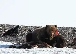 Smaller carnivorous animals are dominated by brown bears and generally avoid direct interactions with them, unless attempting to steal scraps of food. Species which utilize underground or rock dens tend to be more vulnerable to predatory attacks by brown bears. Several mustelids, including badgers, are not infrequently preyed upon and seemingly even arboreal martens may be attacked (especially if unhealthy or caught in furbearer traps).[11][24][68][152] In North America, both species of otter (North American river and sea) have been known to be ambushed by brown bears when on land.[153][154] On the contrary, wolverines (Gulo gulo) are known to have been persistent enough to fend off a grizzly bear as much as 10 times their weight from a kill.[44] In some rare cases, wolverines have lost their lives to grizzly bears and wolverines in Denali National Park will reportedly try to avoid encounters with grizzlies.[12][155] Beyond wolves, other canids may occasionally be killed around their den, most likely pups or kits, or adults if overly incautious near a carrion site, including coyotes (Canis latrans), multiple species of foxes and raccoon dogs (Nyctereutes procyonoides).[21][9][156][157][158] Medium-sized cats may also be rarely killed by brown bears.[159] Seals are on rare occasions killed by brown bears, including eyewitness accounts of Russian bears ambushing spotted (Phoca largha) and harbor seals (Phoca vitulina). Consumption of ringed (Pusa hispida) and bearded seal (Erignathus barbatus) has been reported in the Mackenzie river delta, presumably via predation or scavenging of polar bear kills, as pinnipeds are not usually encountered as carrion from land.[53][76][160]