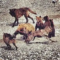 Brown bears regularly intimidate gray wolves (Canis lupus) away from their kills, with wolves occurring in most of the brown bear's worldwide distribution.[2] In Yellowstone National Park, brown bears pirate wolf kills so often, Yellowstone's Wolf Project director Doug Smith wrote, "It's not a matter of if the bears will come calling after a kill, but when." Similarly, in Denali National Park, grizzly bears routinely rob wolf packs of their kills.[12] On the contrary, in Katmai National Park and Preserve, wolves, even lone wolves, may manage to displace brown bears at carrion sites.[139] Despite the high animosity between the two species, most confrontations at kill sites or large carcasses end without bloodshed on either side. Although conflict over carcasses is common, on rare occasions the two predators tolerate each other on the same kill. To date, there are only a few cases of fully-grown wolves being killed by brown bears and none of wolves killing healthy adult brown bears.[140][141][142] Given the opportunity, however, both species will prey on the other's cubs.[12][143] Conclusively, the individual power of the bear against the collective strength of the wolf pack usually results in a long battle for kills or domination.