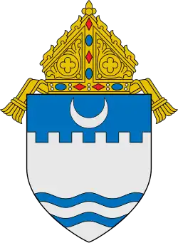 The diocesan arms consists of two blue rivers at the base of a white castle wall with a white crescent moon.