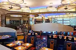 There are five restaurants in the hotel. Chef Mickey (the main restaurant) has an international cuisine buffet, while Hollywood & Dine has quick-service food and beverages. Studio Lounge is a full-service bar with specialty drinks and snacks. The Sunset Terrace opens seasonally, with outdoor BBQ cuisine. The Piano Pool Bar sells drinks to guests sitting around a piano-shaped pool. The Piano Pool also has a side toddler pool, with a slide.