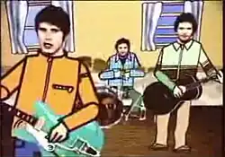 The video for "Do or Die" features Super Furry Animals playing along to the track in a room in a cartoon house. Brightly coloured animations of the group's bodies and surroundings are mixed with live action footage of their heads and instruments. This screenshot shows, from left to right, singer Gruff Rhys, drummer Dafydd Ieuan and guitarist Huw Bunford.