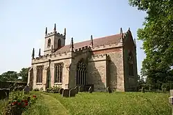 Doddington's Grade II listed parish church is dedicated to St Peter.[8][9] The church was rebuilt in 1771 but retained its Early English font;[10] the rebuilding was under the auspices of Lord Delaval.[11] Pevsner notes that the architects, Thomas and William Lumby, retained and copied north aisle details from the previous Decorated building, and that the church holds a c.1569 chalice, a 1670 alms basin, a 1706 flagon by John Bodington, and a 1706 paten by William Fawdery.[12]