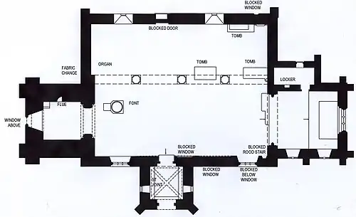There is a tall 13th-century west tower which was structurally crumbling until major repairs in the late 20th century. It contains a ring of six bells, each of which was cast in a different year between 1614 and 1907. The bells hang in a timber frame placed diagonally in the tower. This is a weak layout and the bells remained neglected and unringable for several decades until essential frame strengthening was carried out in 2007.