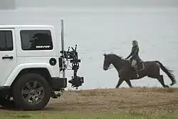 The technique is often used to follow a subject that would otherwise leave the frame (thus also called a following shot), such as an actor or vehicle in motion.[3] A handheld or Steadicam mounted camera following a similar trajectory is called a tracking shot as well. In fact a tracking shot can use any manual or motorized conveyance, and may include careful planning for passing the camera between vehicles or modes. While the core idea is that the camera moves parallel to its subject, a tracking shot may move in a circular or semi-circular fashion, rotating around its subject while remaining equidistant.[4]