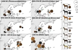 21. ^ Wutke S, Benecke N, Sandoval-Castellanos E, Döhle H, et al. (7 December 2016). "Spotted phenotypes in horses lost attractiveness in the Middle Ages". Scientific Reports. 6: 38548. Bibcode:2016NatSR...638548W. doi:10.1038/srep38548. PMC 5141471. PMID 27924839.