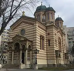 The present church, the fourth in the area, was built on the same site between 1881 and 1885, in Romanesque and Gothic Revival style. Metropolitan Calinic Miclescu led the project. Alexandru Orăscu was the architect, assisted by Carol Benesch and Friedrich Hartmann; his plans were reviewed by Jean-Jules-Antoine Lecomte du Nouÿ. King Carol I and Queen Elisabeth attended the liturgy and cornerstone laying on June 14, 1881, three months after the Kingdom of Romania was proclaimed.[1] When the couple attended, they would sit to the left of the altar on thrones carved with the royal coat of arms and the official motto Nihil sine Deo; these remain in place. During the interwar period, the church was popular with the elite, who would hold weddings and baptisms inside; in keeping with its festive nature, the church has never hosted a funeral.[2]
