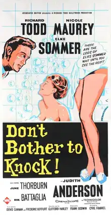 Don't Bother to Knock (U.S. title: Why Bother to Knock) is a 1961 British comedy film directed by Cyril Frankel starring Richard Todd, Nicole Maurey, Elke Sommer, June Thorburn, Rik Battaglia and Judith Anderson.[1] The screenplay is by Denis Cannan and Frederic Gotfurt, based on the 1959 novel of the same name by Clifford Hanley.