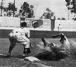 Ross (left), as member of the Hollywood Stars, anticipates the throw as Seattle Rainiers player Dick Gyselman (right) slides in feet first to third base at Gilmore Stadium in Los Angeles, California on September 7, 1947.