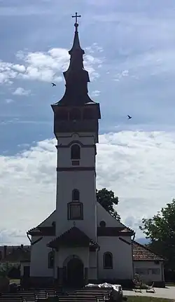 The church is typical of contemporary Transylvania architecture, a Gothic hall church inspired by the Transylvanian Saxons. It features an altar separated from the nave by an iconostasis, a vestibule with a spire, and a small entrance porch to the west. The main part is made of stone, the arches and spire of brick. The floor is around 80 centimeters below ground level. The soil is lower on the north side, suggesting the earlier presence of a cemetery.[1]