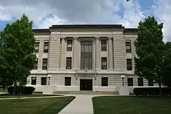 The county's first court session was held in an Illinois Central depot, and later sessions in two different commercial buildings, including one rented by the county recorder.[1]: 33  The initial purpose-built courthouse was a small wooden building, which was erected at private expense.[2] Construction began in 1864 on the second courthouse, a two-story brick building with sheriff's house and jail in the basement.[1]: 33  O.L. Kinney, the Chicago architect responsible for the design, projected a $15,000 cost, but the final cost amounted to nearly three times that estimate.[1]: 34  Further costs appeared on an annual basis, due to numerous problems that required expensive maintenance, and the placement of the jail inside the courthouse was eventually deemed unsafe to use. Consequently, the current courthouse was built in its place over a two-year period, beginning in 1911 and being completed in 1913. A stone Neoclassical structure with a three-part facade featuring Ionic columns in the center, it cost approximately $170,000 to complete.[2]