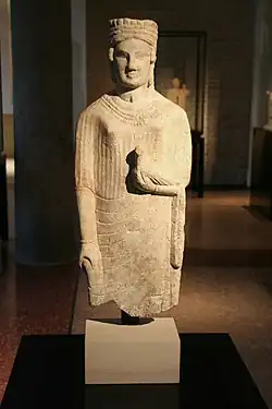 The ancient Greek word for "dove" was peristerá,[1][2] which may be derived from the Semitic phrase peraḥ Ištar, meaning "bird of Ishtar".[1] In classical antiquity, doves were sacred to the Greek goddess Aphrodite,[5][6][1][2] who absorbed this association with doves from Inanna-Ishtar.[2] Aphrodite frequently appears with doves in ancient Greek pottery.[5] The temple of Aphrodite Pandemos on the southwest slope of the Athenian Acropolis was decorated with relief sculptures of doves with knotted fillets in their beaks[5] and votive offerings of small, white, marble doves were discovered in the temple of Aphrodite at Daphni.[5] During Aphrodite's main festival, the Aphrodisia, her altars would be purified with the blood of a sacrificed dove.[7] Aphrodite's associations with doves influenced the Roman goddesses Venus and Fortuna, causing them to become associated with doves as well.[4]