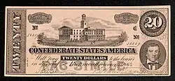 The front of a 19th or early 20th Century facsimile of a $20 Confederate note used for marketing Dr. Morse's Indian Root Pills.