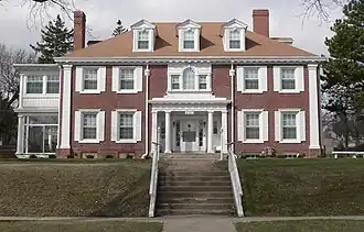 The Dr. Van Buren Knott House is a historic building located in Sioux City, Iowa, United States. Knott was a prominent local physician.[2] He had Chicago architect Howard Van Doren Shaw design this Colonial Revival-style house, which is considered an excellent example of the style.[2] The 2½-story brick structure features a symmetrical facade, an entrance porch with Doric columns, a Palladian window above the front entrance, a single-story semi-circular room in the back, and a hip roof with dormers. On the south side of the house is a full width porch, with a sleeping porch on the second floor. A pergola in the back leads to a detached two-car garage, which was built a couple of years after the house. The house and garage were listed together on the National Register of Historic Places in 1999.[1]