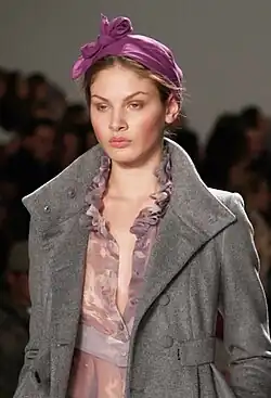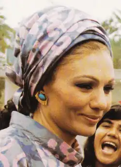 In the early 1970s, the London boutique Biba featured turbans, often paired with kaftans or diaphanous blouses – a look in keeping with the prevailing trends for both 1920s/30s and eastern styles. Often turbans were created as part of eveningwear; an example of a Biba evening coat and matching turban in rayon and Lurex knit is now part of the Victoria and Albert Museum archive.[21] American designer Halston also featured the turban for eveningwear, and dressed fashion icons such as Bianca Jagger.[22] The fashion for draped turbans also spread beyond disco glamour – Elizabeth Taylor, Joan Collins and the Queen all wore them with daywear.[23][24]